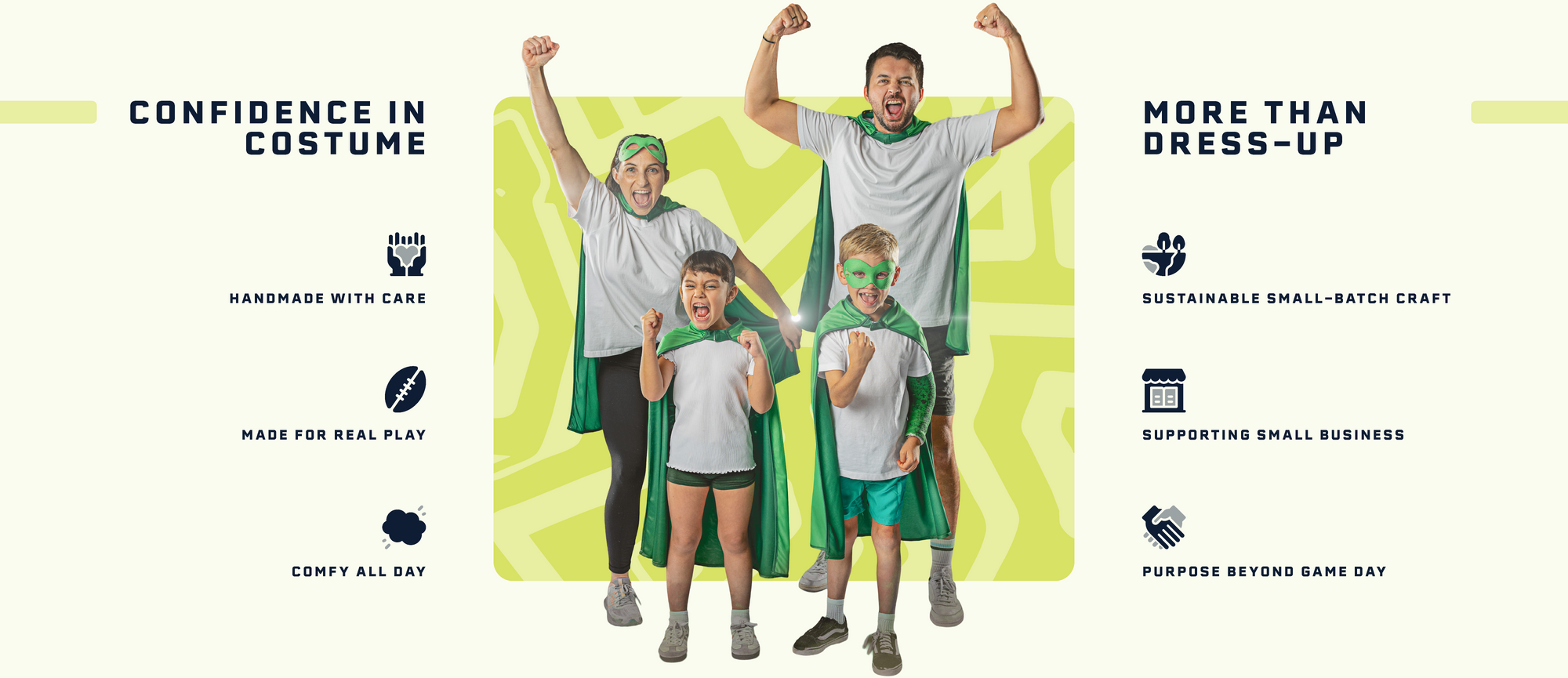 Nathaniel is a lifelong Sharkies fan and I grew up in a proud Broncos family. On my mum’s side, my family has spent more than 115 years in the costume world, creating joy, creativity and confidence through dress-up. It is a tradition built on fun, imagination and family connection, and it is at the heart of everything we do.