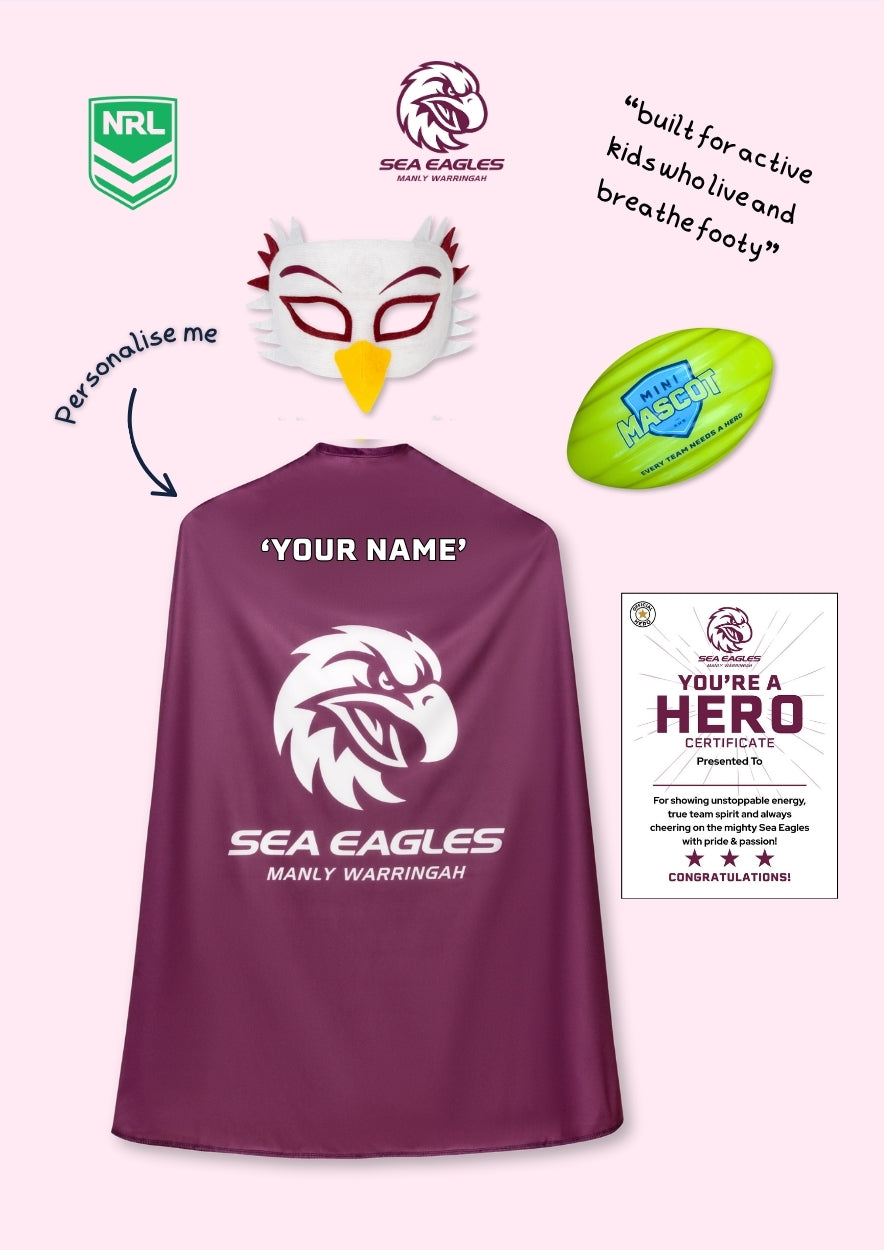 🦸 Personalised Hero Cape & Mask – transform your little fan into a true Sea Eagles hero, complete with their name for a one-of-a-kind touch.
