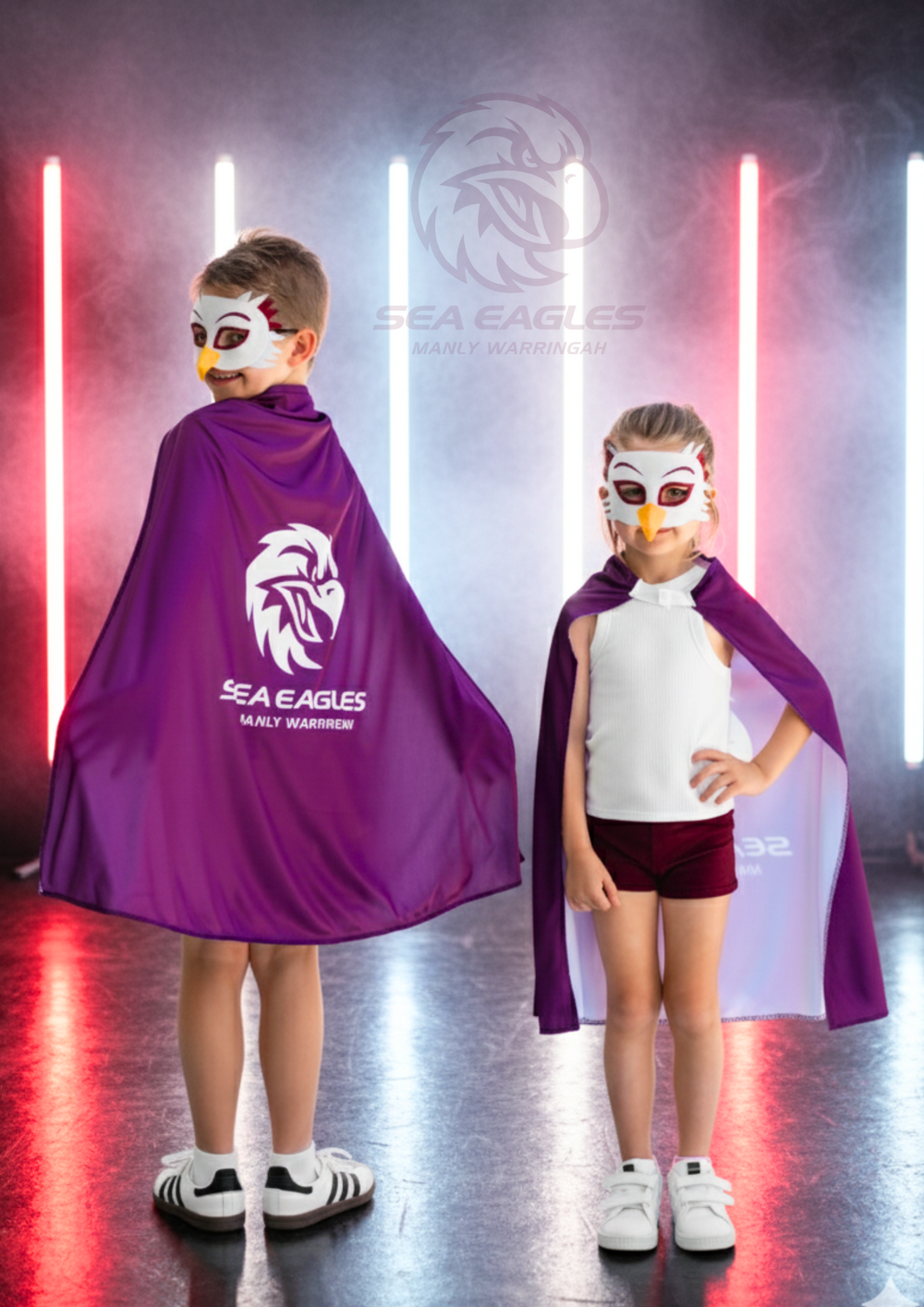 Soar to new heights with this Manly Sea Eagles Hero Pack. This officially licensed NRL merch is designed for the manic manly fans out there. Made for game days at the stadium or at home, this two-piece mask and cape set will have you looking the part.