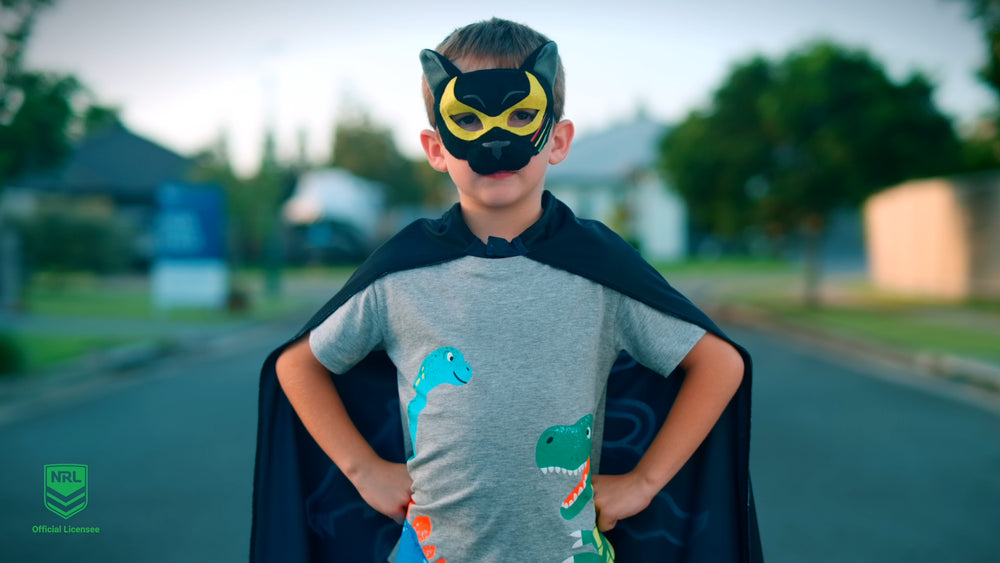 Show your fierce side as you suit up in this Panthers Hero Pack. This officially licensed NRL merch is designed for the proudest of Penrith fans. Made for game days at the stadium or at home, this two-piece mask and cape set will have you looking the part.