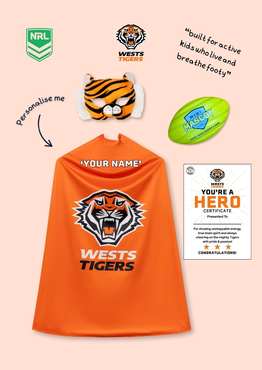 🦸 Personalised Hero Cape & Mask – transform your little fan into a true Tigers hero, complete with their name for a one-of-a-kind touch.